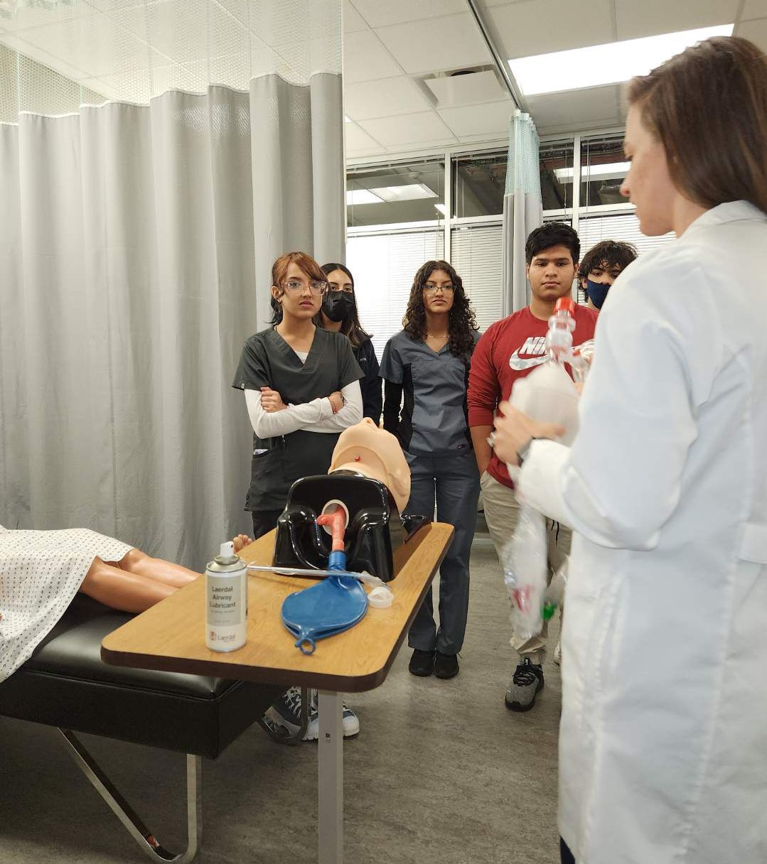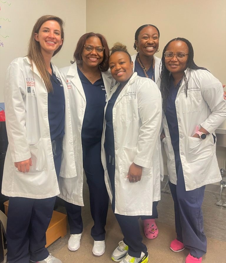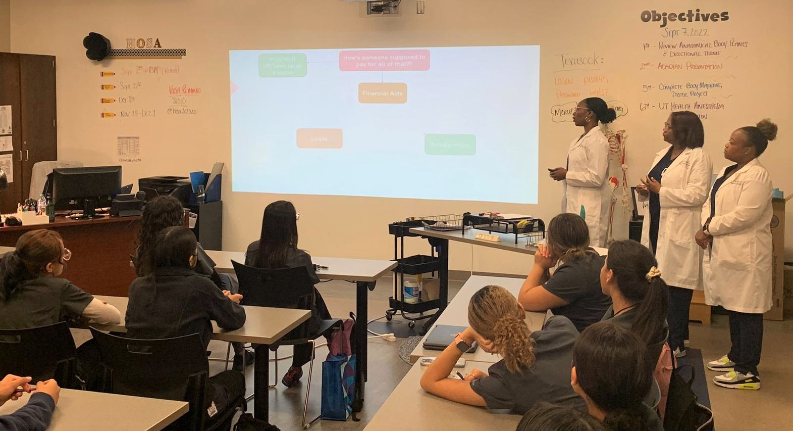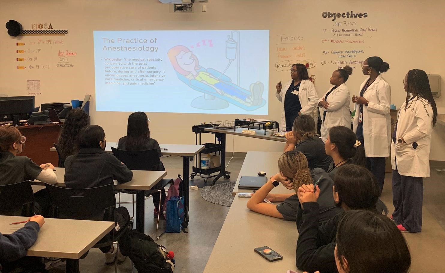 On September 7, 2022, Drs. Omonele Nwokolo, Stephanie Bradley, D’Andrea Ceasar, Nneka Madu, and Tesia Oliver, from the department of anesthesiology went to the Dr. Kirk Lewis Career and Technical High School in Pasadena, TX. They discussed the paths to Anesthesiology Care Team and Physicians, CRNAs and AAs. They gave a small glimpse into what they do via ultra sound and airway stations and by holding Q/A sessions. A special thanks to everyone involved that helped make this program possible, including Dr. Osa Obanor, Orlanda Smith, CRNA, and Shokeir Mayada, CAA.