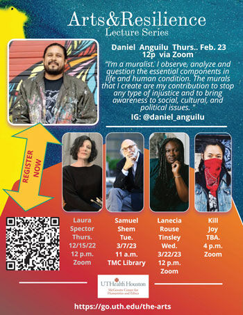 The four lectures in 2023 begin with a Zoom session featuring Houston-based graffiti artist Daniel Anguilu, at noon Feb. 23. Anguilu started painting graffiti at an early age and has traveled to cities in the United States, Mexico, Peru, Spain, and Italy, to paint murals and participate in art exhibitions. He also has visited Asia, Africa, and Central America to enrich his knowledge of pre-colonial art and the cultures in those regions.