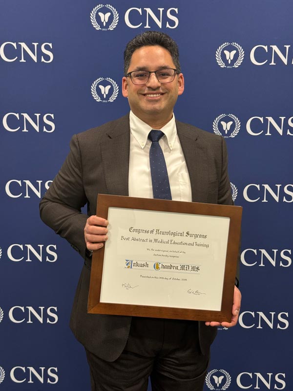 Chandra received the award at the 2025 Congress of Neurological Surgeons Annual Meeting in Los Angeles, one of the world’s largest neurosurgical conferences. The meeting provides a global forum for neurosurgeons, researchers, educators, and trainees to exchange leading-edge science and best practices.