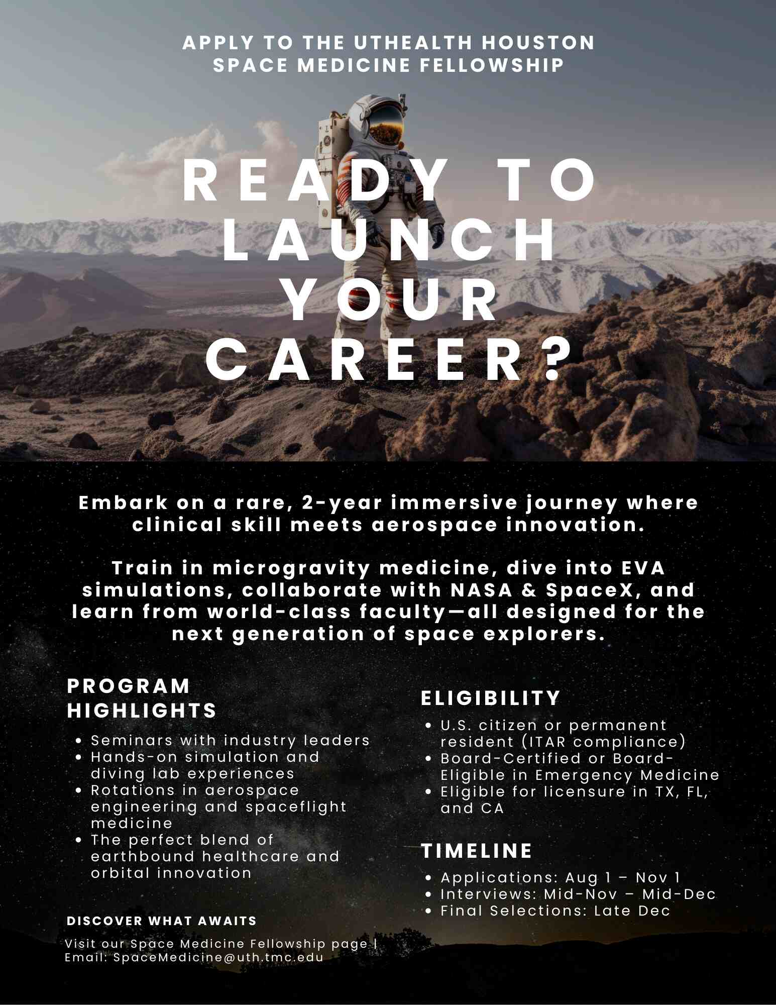 Our department is excited to announce that applications are now open for the UTHealth Houston Space Medicine Fellowship. This is a pioneering, 2-year immersive program designed to prepare physicians for the evolving frontier of aerospace medicine.