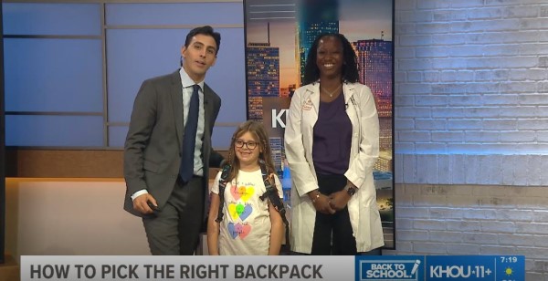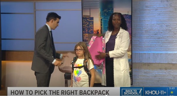 Angie Curtis, MD, CAQSM, appeared on KHOU-TV Channel 11 at 6:45 and 7:15 a.m. to talk about the best backpacks for kids and how to properly wear them. News anchor Jacob Rascon shared photo highlights from the interviews on Facebook and Instagram.
